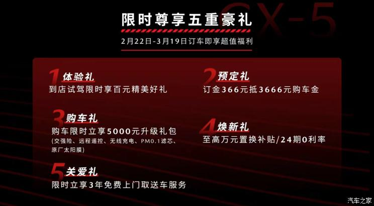 [ 资讯]  2月22日,新款马自达CX-5正式开启预售,新车预售价17.98万起。为此,马自达推出“预售期尊享 万元补贴限时礼遇”五重豪礼,不仅有366元抵3666元购车金,更有至高万元的置换补贴。与此同时,我们获取到了新款马自达CX-5(参数|询价)车型的配置信息,新车将推出6款配置车型,动力上则搭载2.0升与2.5升自然吸气四缸发动机,按照规划新车有望于2022年第一季度正式上市。